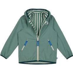 The outside of the reversible rain jacket VALAS is waterproof and windproof, the inside provides additional warmth on cooler days. The water- and dirt-repellent material is breathable for a comfortable wearing climate, from size 120/130 the jacket comes with a round hood. Perfect for every day from April to November.