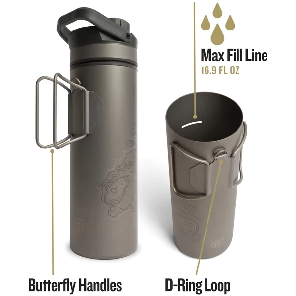 - Heat it up! Utilizing the butterfly handles, the Outer Ti Cup can be used to heat water and cook food alongside hot coals or near a direct flame. Can also be used with the Grayl titanium camp stove.