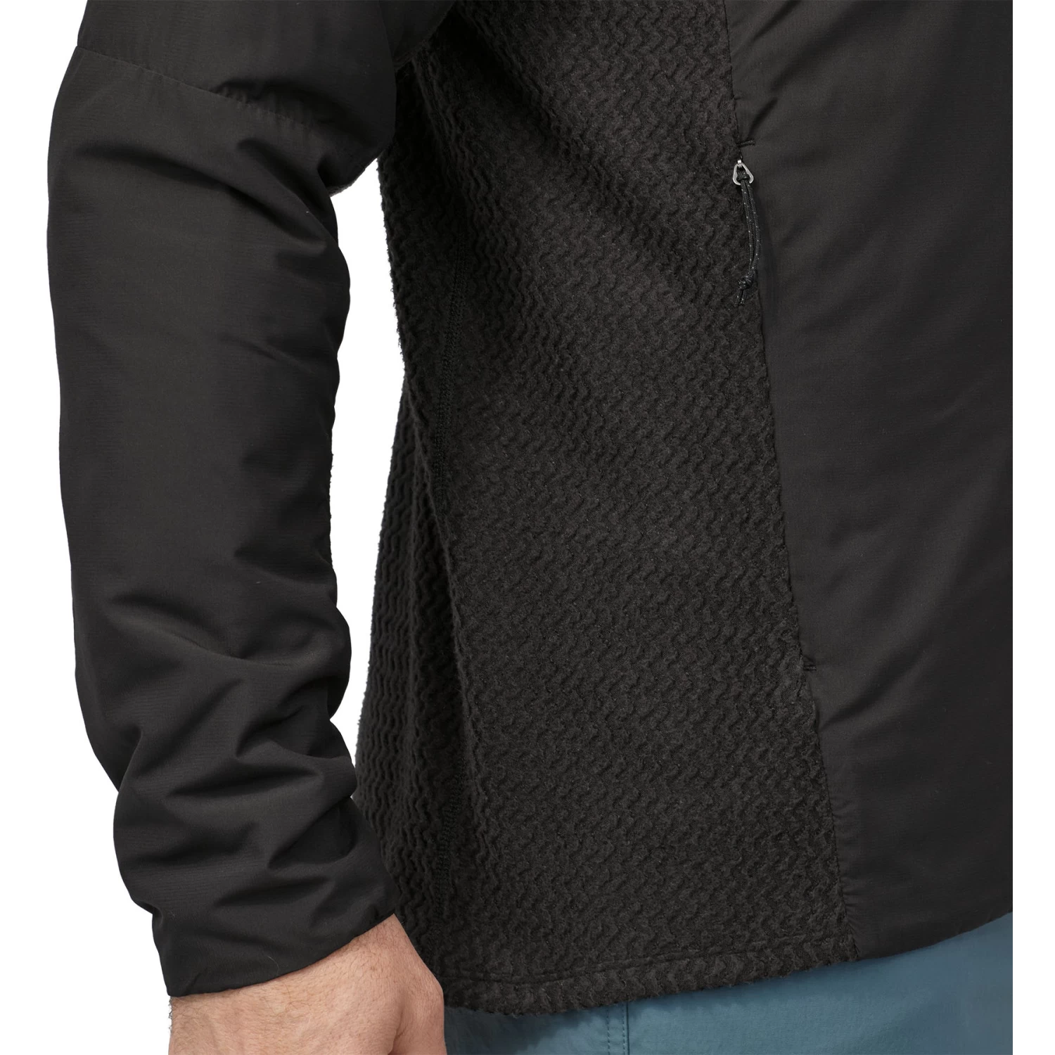 - Pocket Details: The two handwarmer pockets and left chest pocket have zippers and a slim, close-fitting design to stay out of the way under a harness and pack; stows in the left chest pocket.