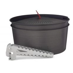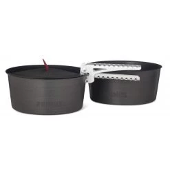 The pots are made of hard anodized and high grade aluminum, which gives you a robust set while keeping it at a low weight. Both pots have several layers of non-stick coating to make them as easy as possible both to use and clean. Make sure you do not use metal utensils in pots with a non-stick coating as doing so can destroy it. The pots can be stored into each other which creates a rattle free unit. The set comes with a lid that has an integrated strainer – ideal when you pour pasta water. It also includes tongs and a storage bag. Enough for 1-3 people.