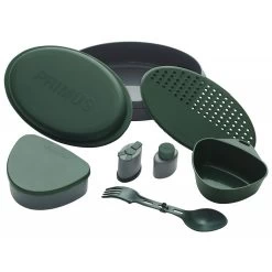 A complete eight-piece set that includes everything you need to eat out in the great outdoors. Two deep plates, a spice jar with three compartments, a small container that can be used for oil or washing-up liquid, storage container with tight-fitting lid, an outdoor cup, folding spork and an all-in-one cutting board, colander, grater and knife. The Meal Set is dishwasher safe and microwave-safe.