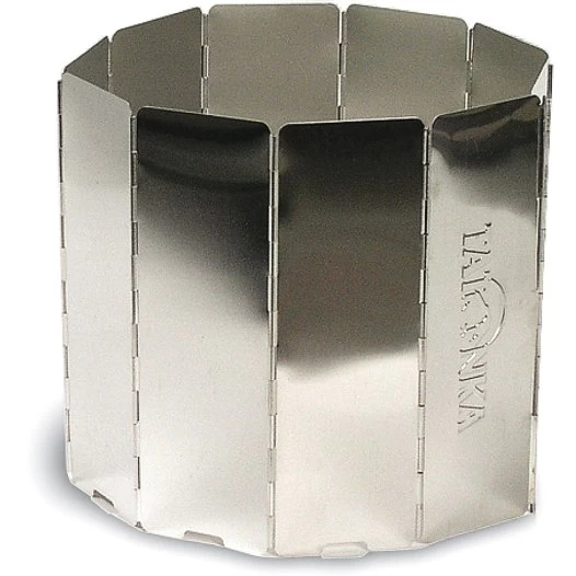 Aluminium wind protection for your camp stove. When needed, simply fold around the cooker and secure into the ground with the two sliders – simple as that! Diameter 25Â cm