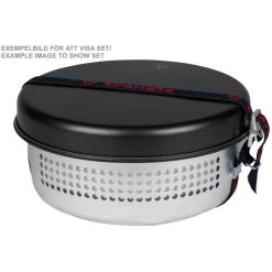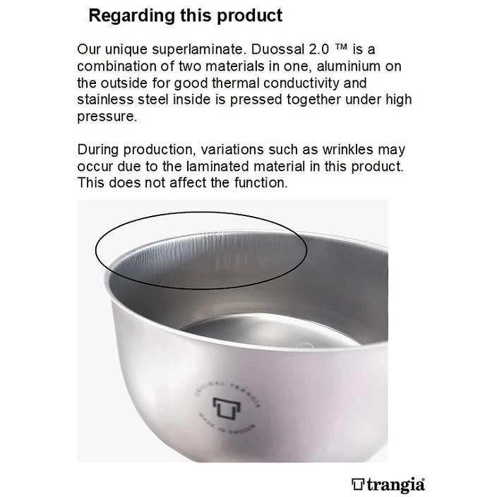 is Trangia’s unique super laminate. Duossal 2.0 is a perfect combination of two materials in one, pressed together under high pressure. Aluminium on the outside for good thermal conductivity, and stainless steel inside, which makes the pans scratch resistant and easy to clean. Duossal pans are durable and heat up quickly. The thickness of the material is a total of 0.8mm. Stainless steel 0.3 / Aluminium 0.5 mm.Â