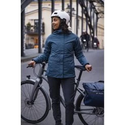 This modern bike rain jacket was made predominantly from recycled materials using an innovative mass balance process and is of course also suitable for normal everyday city use. The outer material was made with Eco Finish environmentally friendly water repellent without fluorocarbons (PFC).
