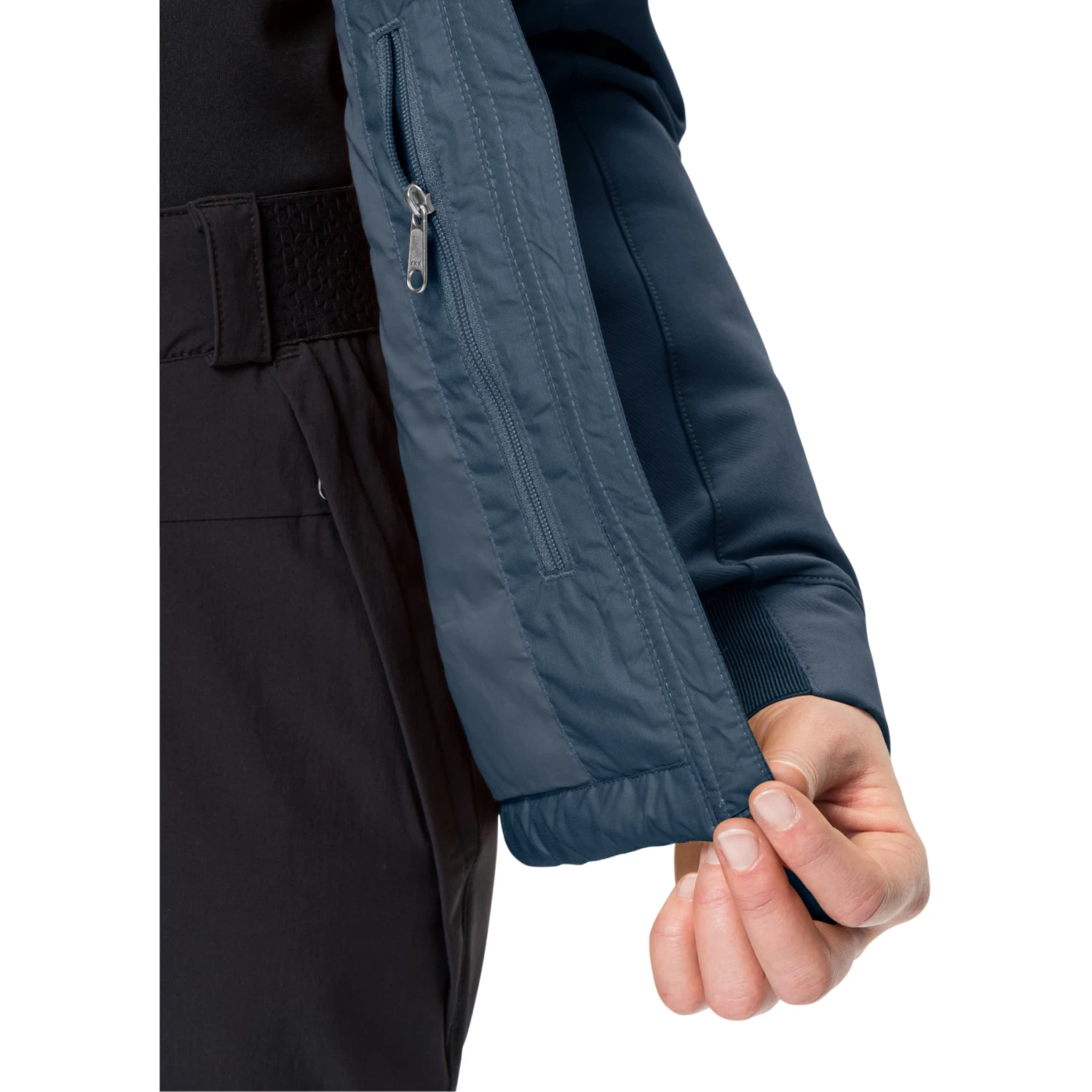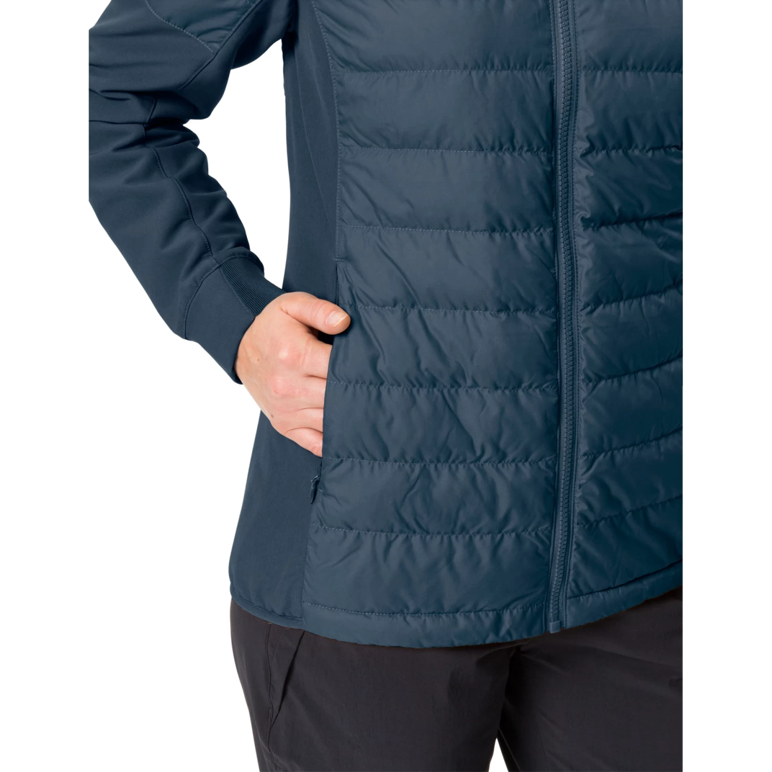 With this sporty women’s jacket for hiking, tours in autumn and winter are a breeze. The Women’s Elope Hybrid Jacket is highly breathable and reliably protects against chilling after a strenuous mountain climb. The women’s jacket has a sporty cut and is predominantly windproof. The elastic, highly breathable and environmentally friendly material on the arms and sides ensures high freedom of movement. Valuable small items can be safely stowed in the two practical zipper pockets on the outside and one on the inside.